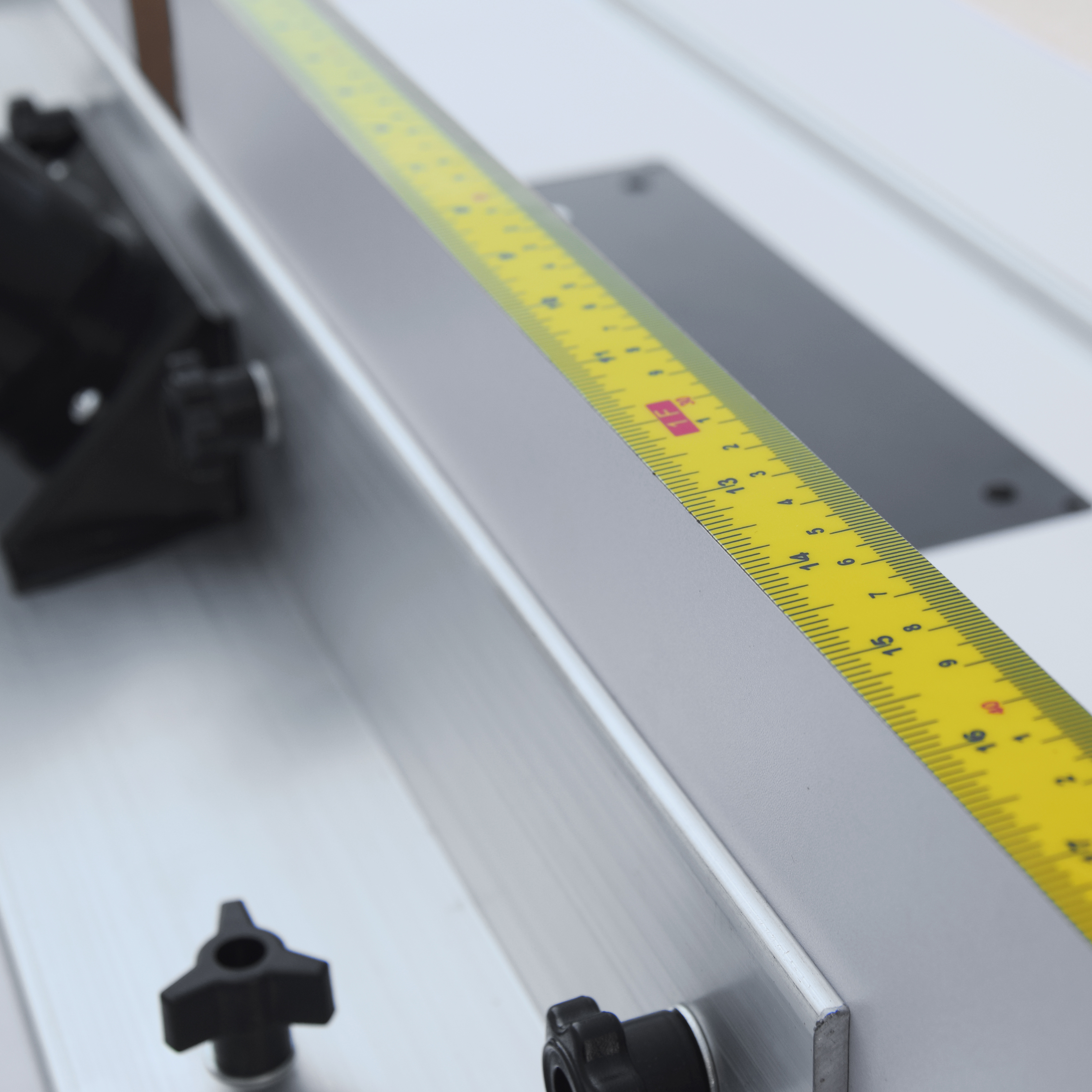 - Stabilní, nastavitelné frézovací dorazy: z MDF, s měřicí škálou a T-drážkou (8 mm)