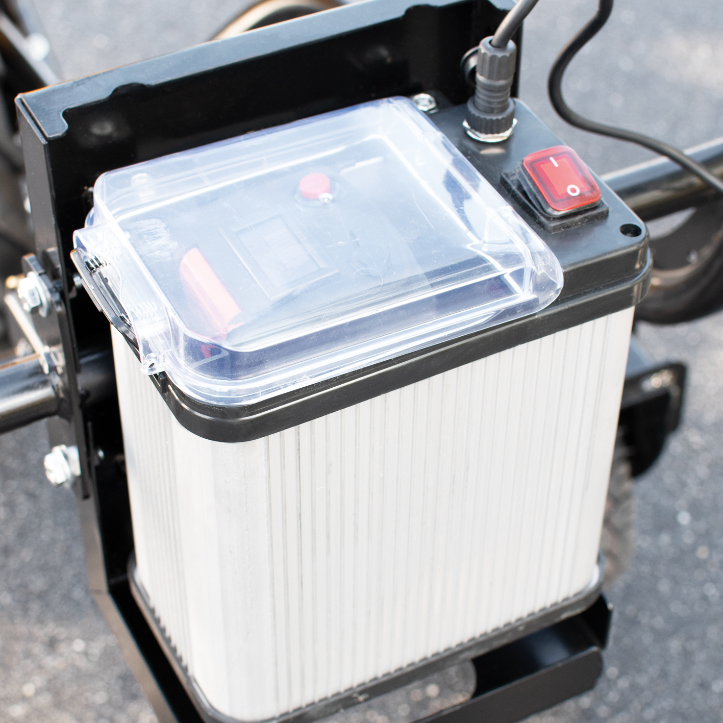 - Robustní konstrukce: masivní rám, chráněný akumulátor v uzavřeném boxu