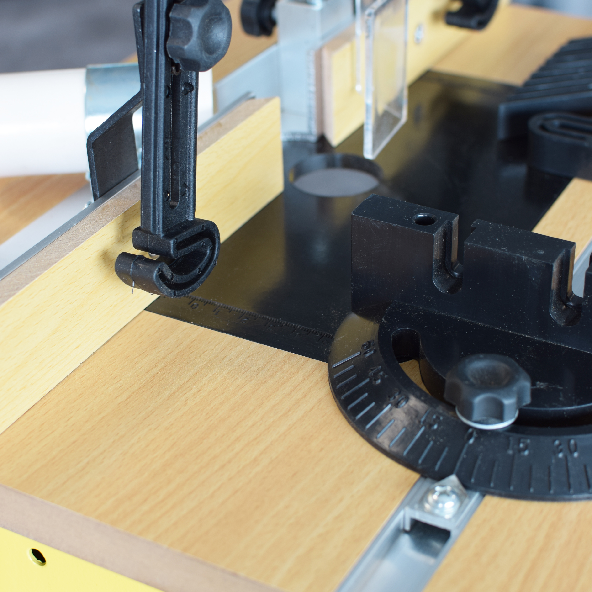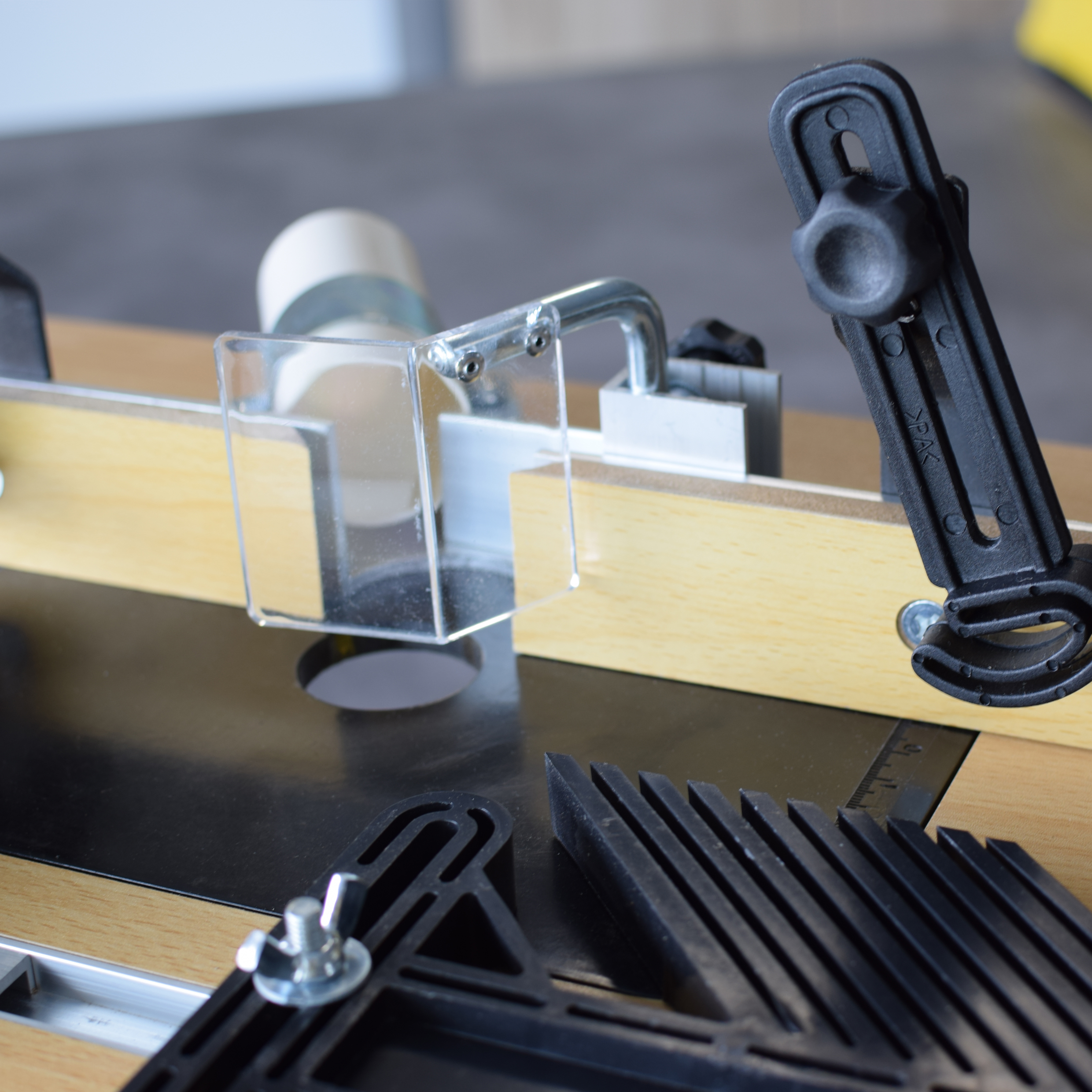 - Frézovací doraz: stabilní MDF doraz s integrovanými držáky, ochranným krytem a odsávacím připojením