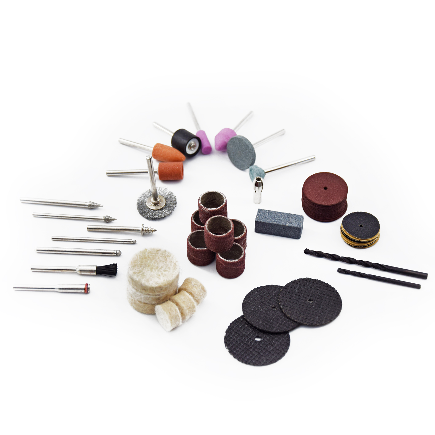 Kompletní 64dílná sada nářadí pro lupínkovou pilu DEK-1600V. Obsahuje různé nástavce pro broušení, leštění, frézování a další práce. Vše je přehledně uloženo v praktickém plastovém boxu.