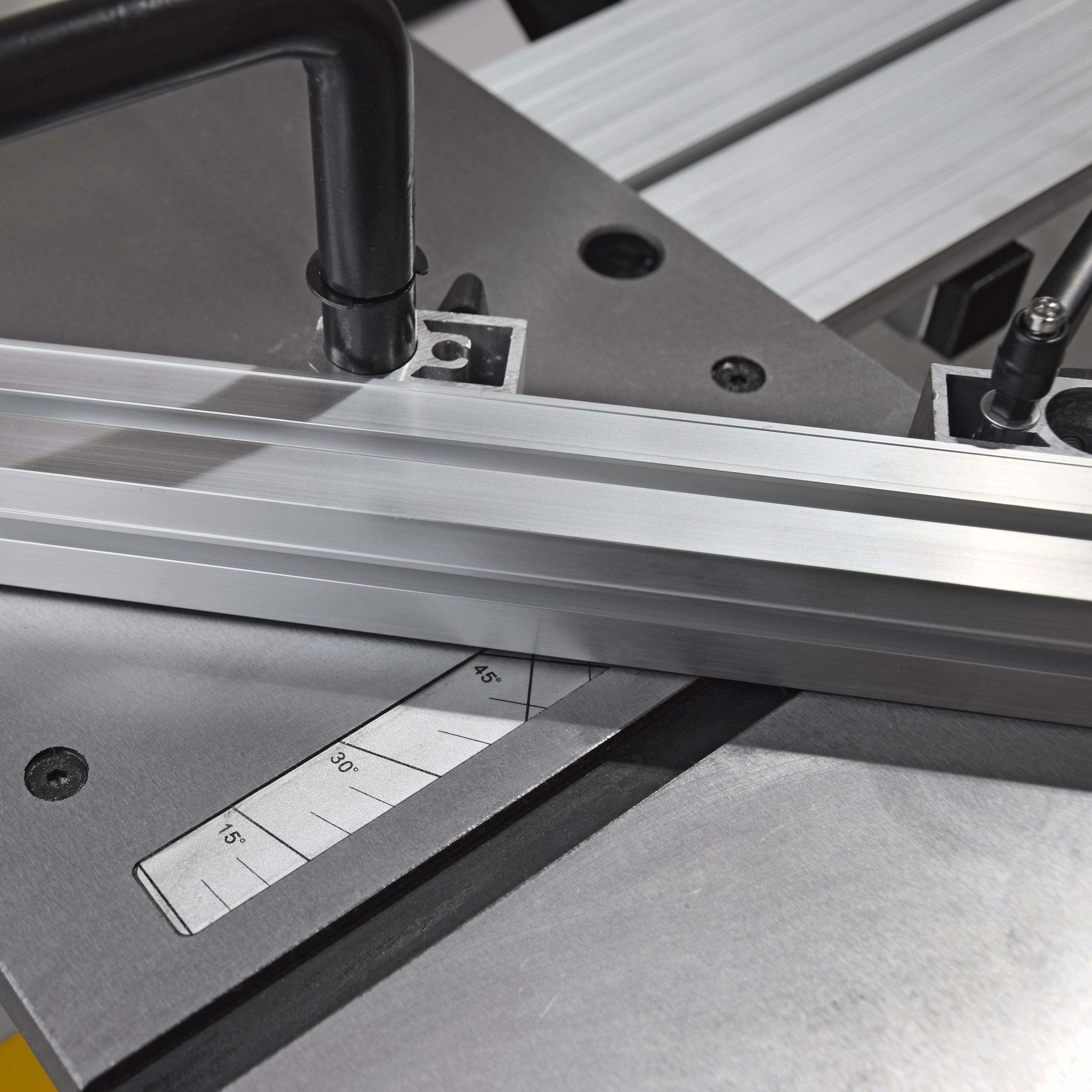 Pro maximální komfort obsluhy lze výšku a sklon pilového kotouče (až 45°) pohodlně nastavit pomocí ručních kol a stupnice. Posuvný stůl, rovněž vyrobený z masivní litiny, je doplněn o nastavitelný úhlový doraz s přítlačným držákem.